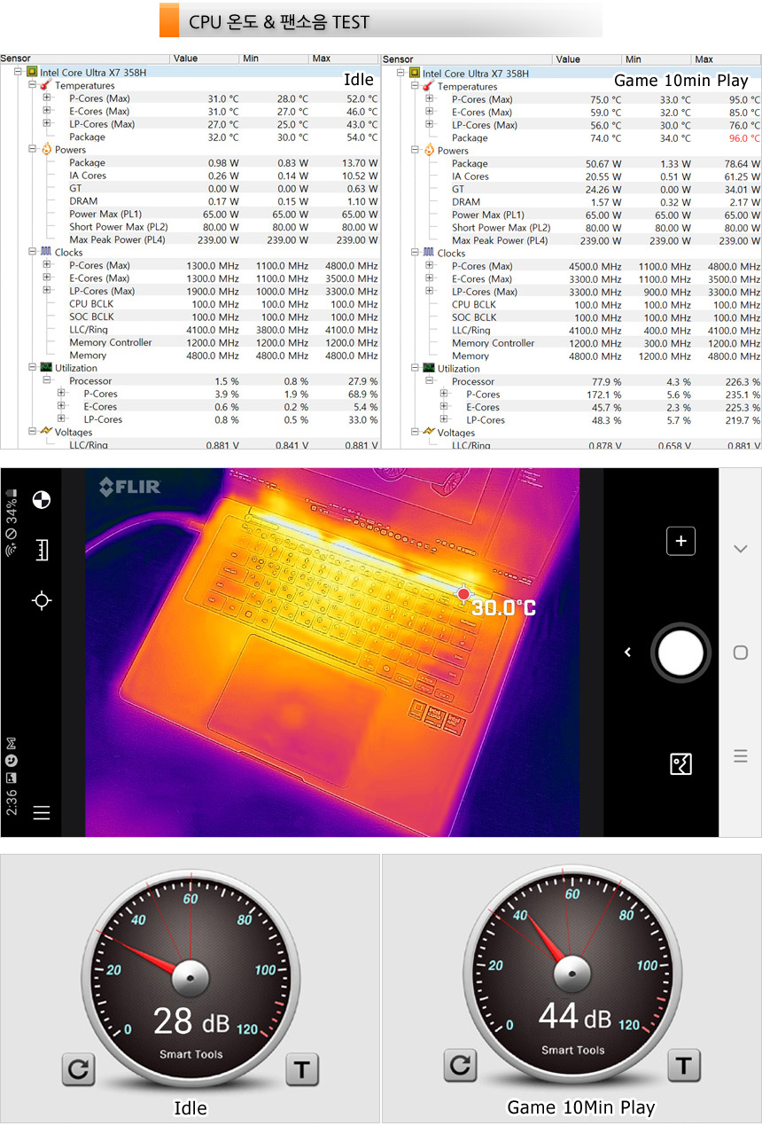 열화상 카메라를 이용해 게임 실행중 열분포를 확인했는데 상단중앙을 중심으로 열이 퍼져나가며 팜래스트 온도도 낮아 편하게 손을 올려두고 타이핑 할 수 있다. 뿐만 아니라 팬소음 테스트도 실행했는데 (최고 성능 모드) 캐주얼한 작업시에는 생활소음에 묻혀 팬소음이 들리지 않았으며 게임이나 영상편집 S/W 등을 실행했을 때에는 44dB 까지 팬소음이 높아지는 것을 확인할 수 있었다. (갤럭시북 6 프로 보다는 팬소음이 큰 편이다.)