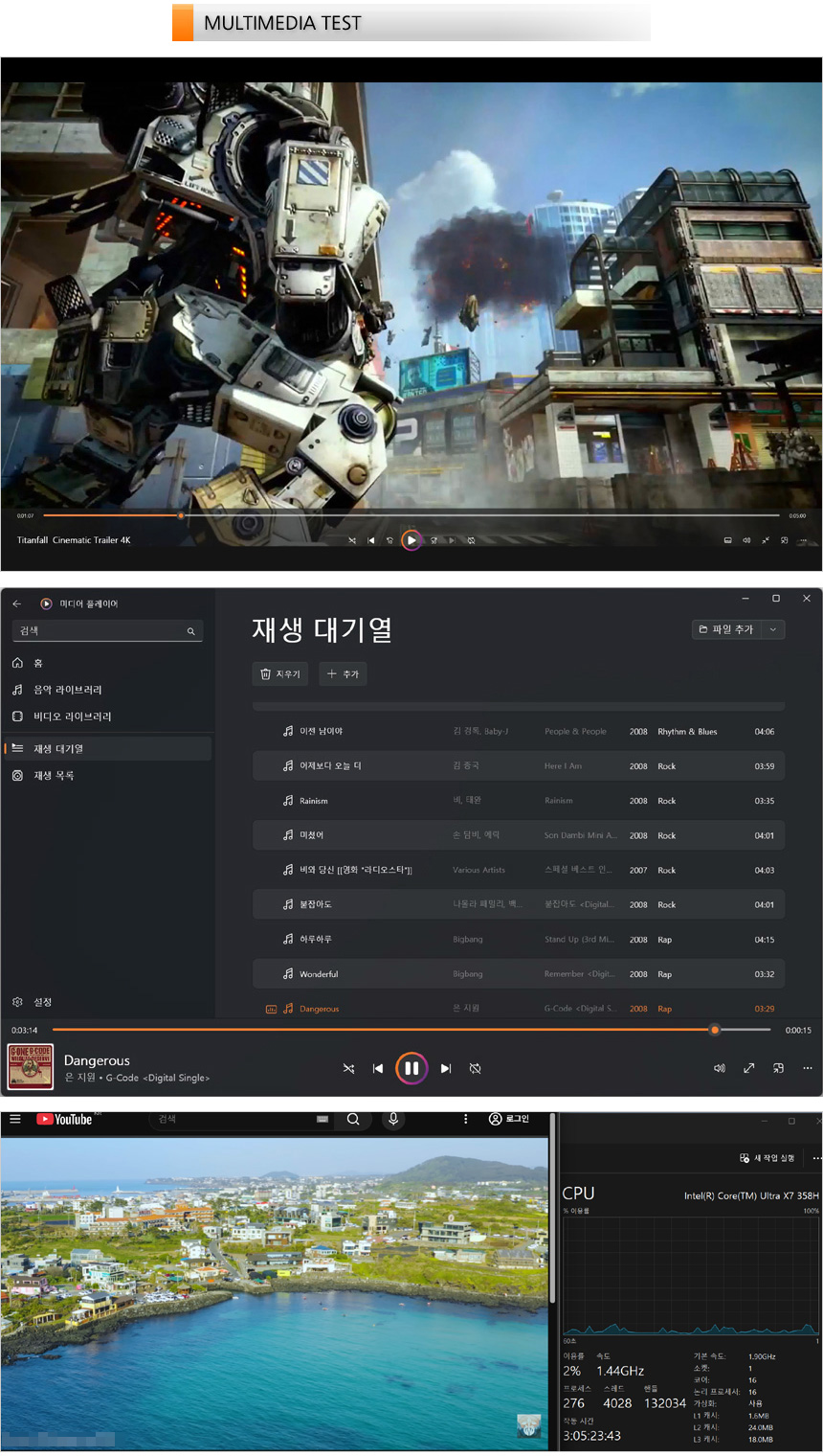 MP3 파일을 이용해 스피커의 사운드 테스트를 진행하고 있는 모습으로 4개의 우퍼와 2개의 트위터를 각각 지원하고 출력도 높아 폭발적인 사운드를 즐길 수 있었다. 특히 돌비 애트모스 까지 지원해 일반 노트북에서는 들을 수 없는 입체감도 경험할 수 있었다. (키보드 측면에 스피커가 배치되어 더 카랑카랑한 소리를 들려 주었다.) 마지막 사진은 유튜브 고화질 동영상을 이용해 CPU 점유율을 테스트 하고 있는 모습으로 (2160P@60FPS) 2-8% 대의 점유율을 보여 주었으며 인터넷을 실행했을 때 10% 중반까지 점유율이 올라가는 것을 확인할 수 있었다.
