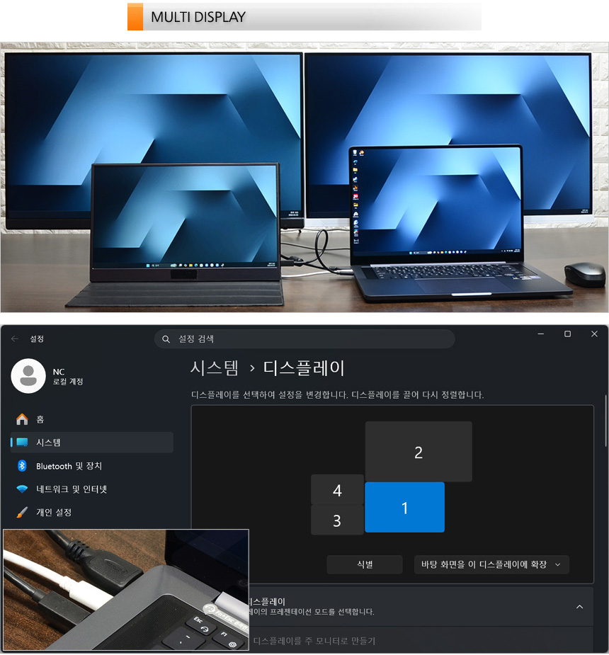 3개의 모니터 연결이 가능해 노트북 디스플레이 포함 4개의 모니터 사용이 가능하다. 상단의 사진은 연결 테스트를 진행하고 있는 모습으로 원활하게 작동하는 것을 확인할 수 있었다. 다양한 창을 띄어두어야 하는 대학생이나 직장인 들이 편하게 사용할 수 있을 것이다.