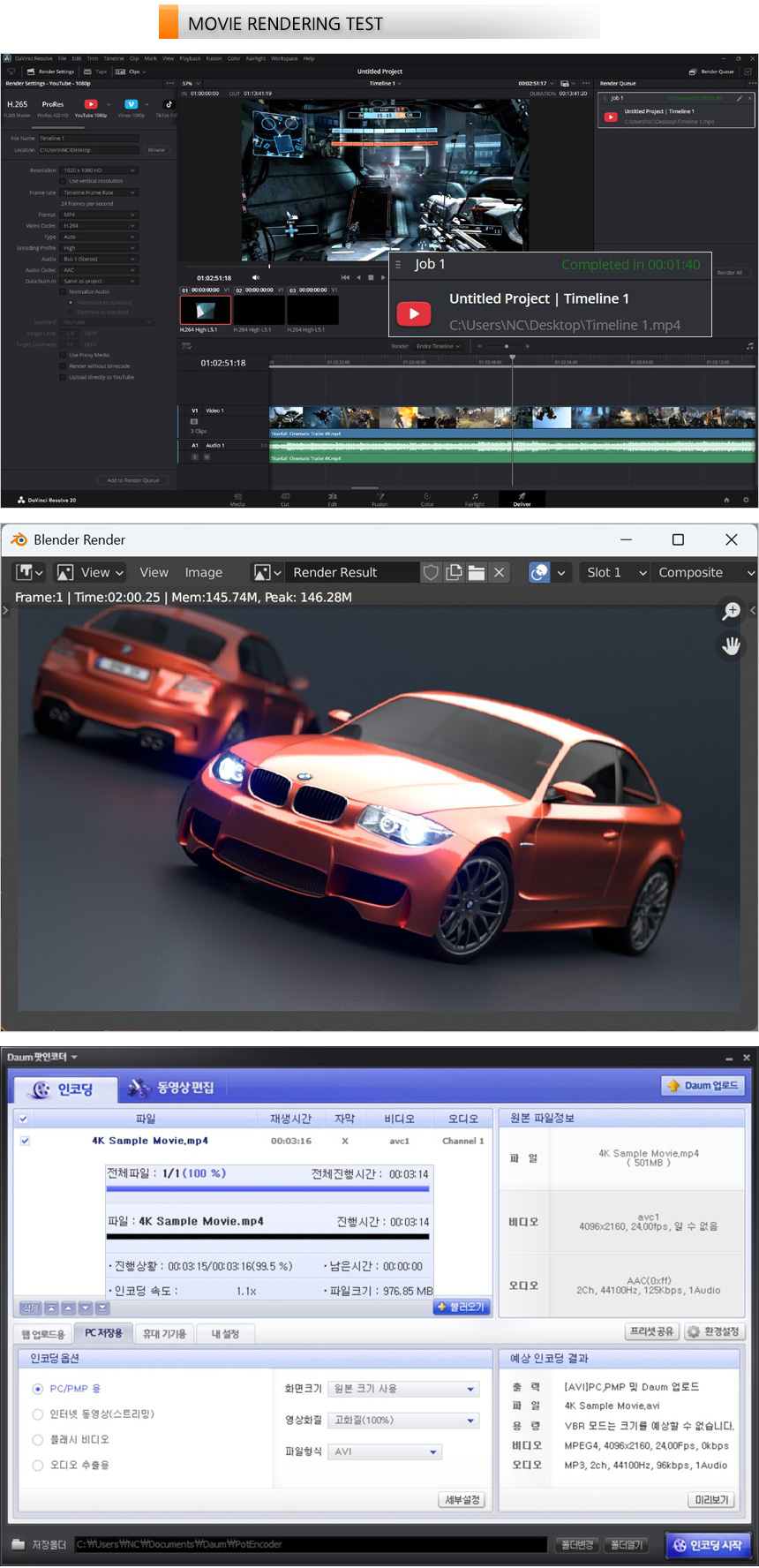 영상편집 S/W 다빈치 리졸브를 이용해 랜더링 테스트를 진행하고 있는 모습으로 (640MB, 920MB, 990MB 4K 동영상을 단일 동영상으로 랜더링, FHD 해상도에 H.264 비디오 코덱) 1분 40초가 소요되는 것을 확인할 수 있었으며 블랜더 랜더링 테스트에서는 2분대의 빠른 랜더링 시간을 보여주었다. 또한 다음 팟인코더를 이용해 4K 동영상의 인코딩을 진행하고 있는 모습으로 3분 14초의 인코딩 시간을 보여주었다. @ 동일 프로세서를 사용한 갤럭시북 6 프로 대비 모든 시간이 단축된 것을 확인할 수 있었다.