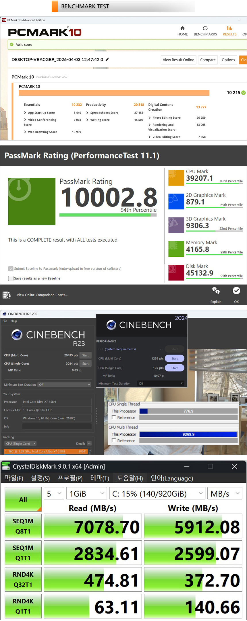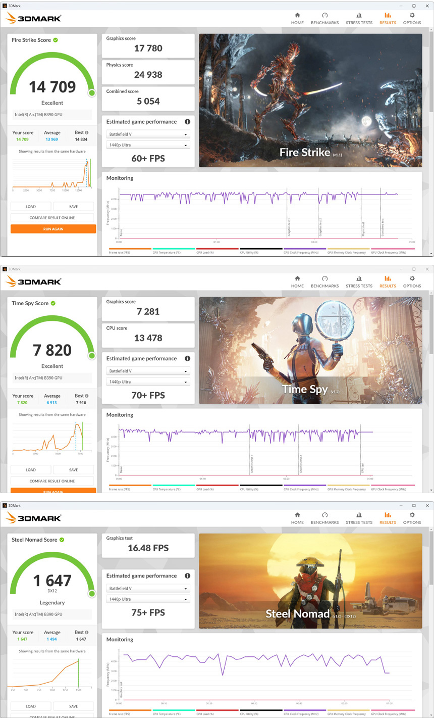 3DMARK를 이용해 외장그래픽의 성능을 확인하고 있는 모습으로 구형 게이밍 노트북 수준의 높은 스코어를 보여주었다. 게임 용도로도 유용하게 활용할 수 있을 것이다. (기존 아크 그래픽대비 1.6~1.8배 스코어가 높아졌다.)