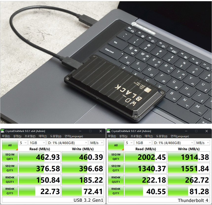 썬더볼트 4 단자를 지원해 빠른 데이터 전송이 가능하다. 상단의 사진은 외장 SSD (USB 3.2 Gen2x2 지원모델) 를 이용해 테스트를 진행하고 있는 모습으로 USB 3.2 Gen1과 확연한 차이를 보여주는 것을 확인할 수 있다.