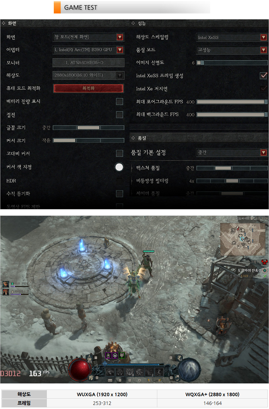 디아블로 4를 이용해 게임 테스트를 진행하고 있는 모습으로 기본 해상도인 WQXGA+ 에서도 원활한 플레이가 가능한 것을 확인할 수 있었다. 디아블로4는 XeSS 프레임 생성이 가능해 게이밍 노트북 수준의 프레임으로 게임을 즐길 수 있다. (애로우레이크와 비교하면 최대 프레임이 2배 이상 높아졌다.) @ 참고로 동일 프로세서가 탑재된 갤럭시북 6 프로의 WQXGA+ 프레임은 105-139 였다.