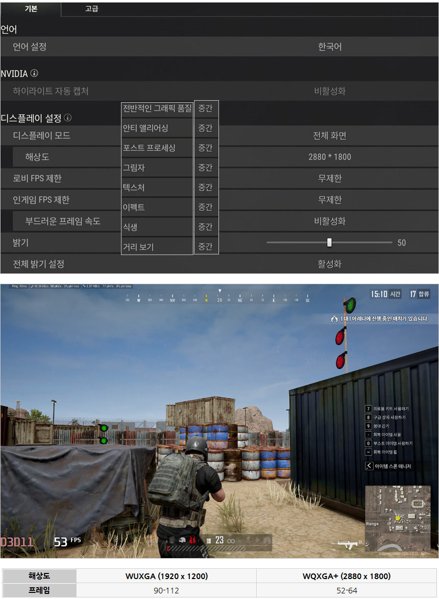 배틀그라운드를 플레이 하고 있는 모습으로 업스케일링 기술을 지원하지 않아 고전할 것으로 예측했는데 기대 이상으로 높은 프레임을 보여주어 원활하게 게임을 즐길 수 있었다. WUXGA 로 해상도를 설정하면 성능걱정 없이 플레이 할 수 있을 것이다.