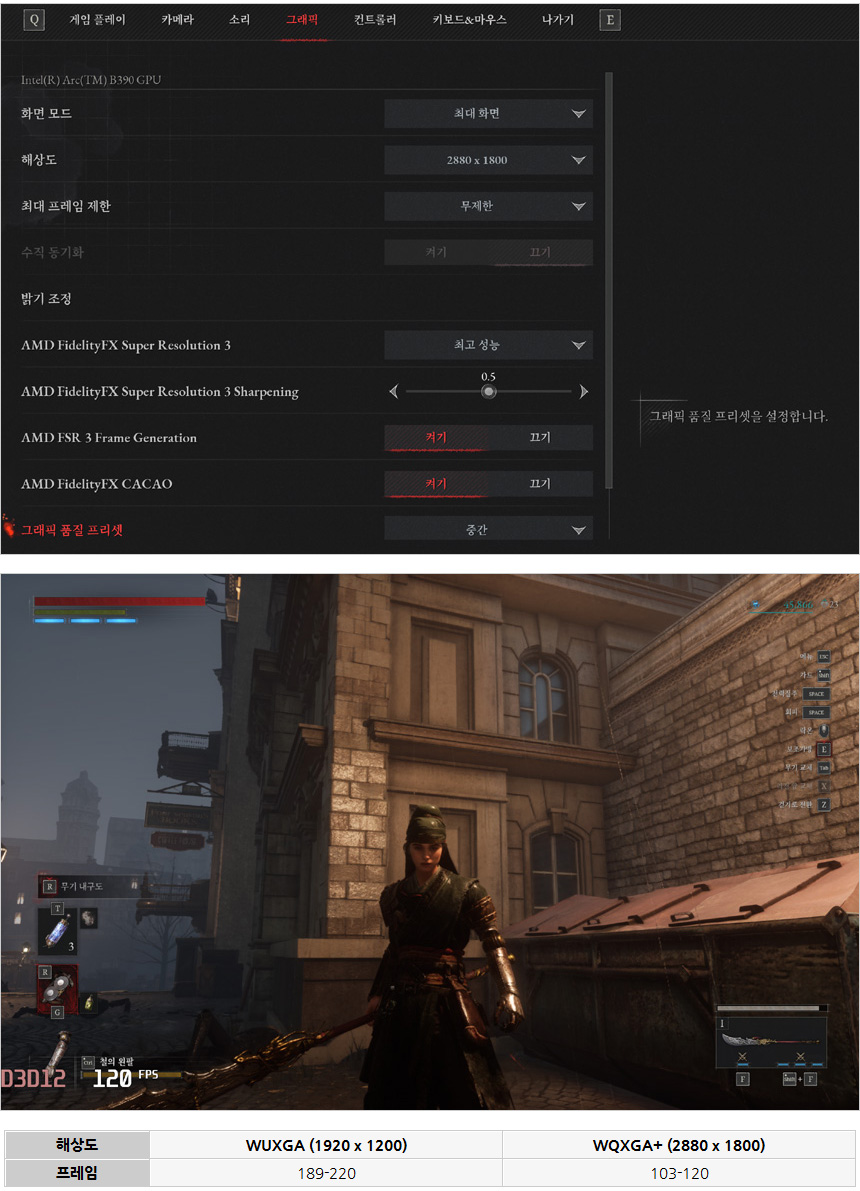 P의 거짓을 중간옵션에서 플레이 하고 있는 모습으로 FSR3 프레임 생성을 활성화 하면 WUXGA 기준 200 프레임 이상으로 올라가는 것을 확인할 수 있었다. 여유롭게 게임을 즐길 수 있을 것이다. (WQXGA+ 해상도에서도 부드럽게 게임을 즐길 수 있다.) 참고로 동일 프로세서가 탑재된 갤럭시북 6 프로의 WQXGA+ 프레임은 56-61 이었다.