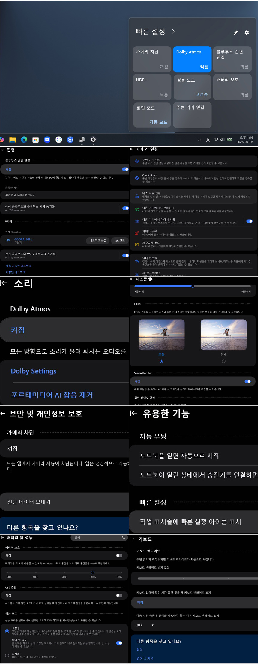 삼성 Settings의 모습으로 연결과 사운드 & 디스플레이 설정이 가능하며 퍼포먼스 설정과 자동부팅, USB 충전, 키보드 백라이트 설정 등을 지원한다. 또한 보안관련 설정에서 카메라 비활성화가 가능해 사생활 침해등을 미연에 방지할 수 있다. @ 성능모드에 최대 팬 속도 메뉴가 추가된 것이 눈에 띈다.