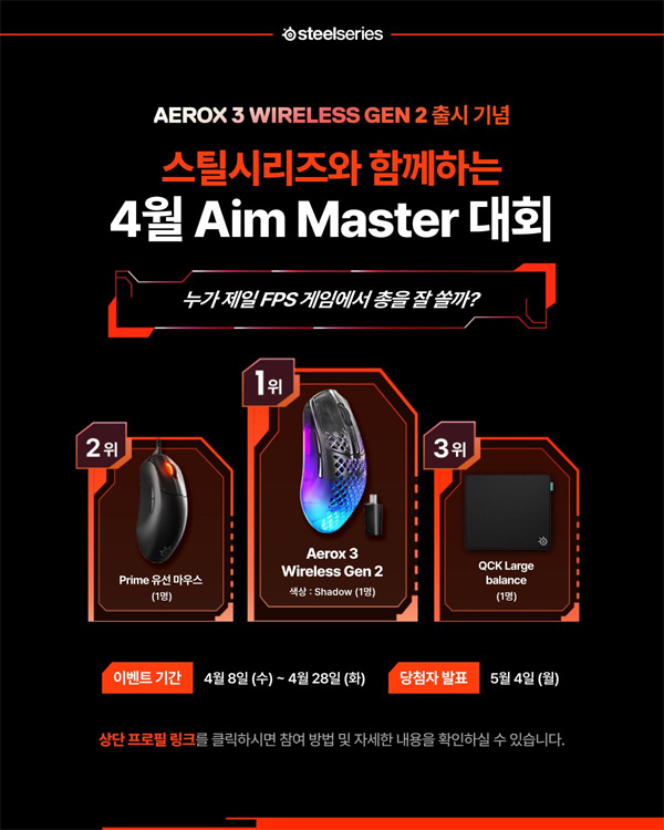 스틸시리즈가 무선 게이밍 마우스 신제품 ‘에어록스 3 무선 Gen 2(Aerox 3 Wireless Gen 2)’ 출시를 기념하여 매달 에임 마스터 대회 이벤트를 진행한다고 밝혔다.
