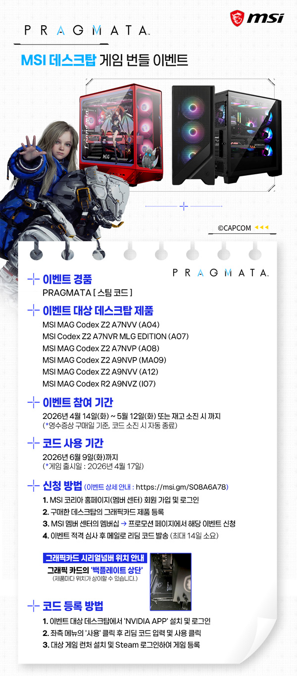 MSI는 지포스 RTX 5090, 5080, 5070 Ti, 5070그래픽카드를 탑재한 MSI 게이밍 데스크탑 구매 고객을 대상으로 캡콤의 신작 ‘프래그마타’ 게임 코드를 증정하는 프로모션을 진행한다.